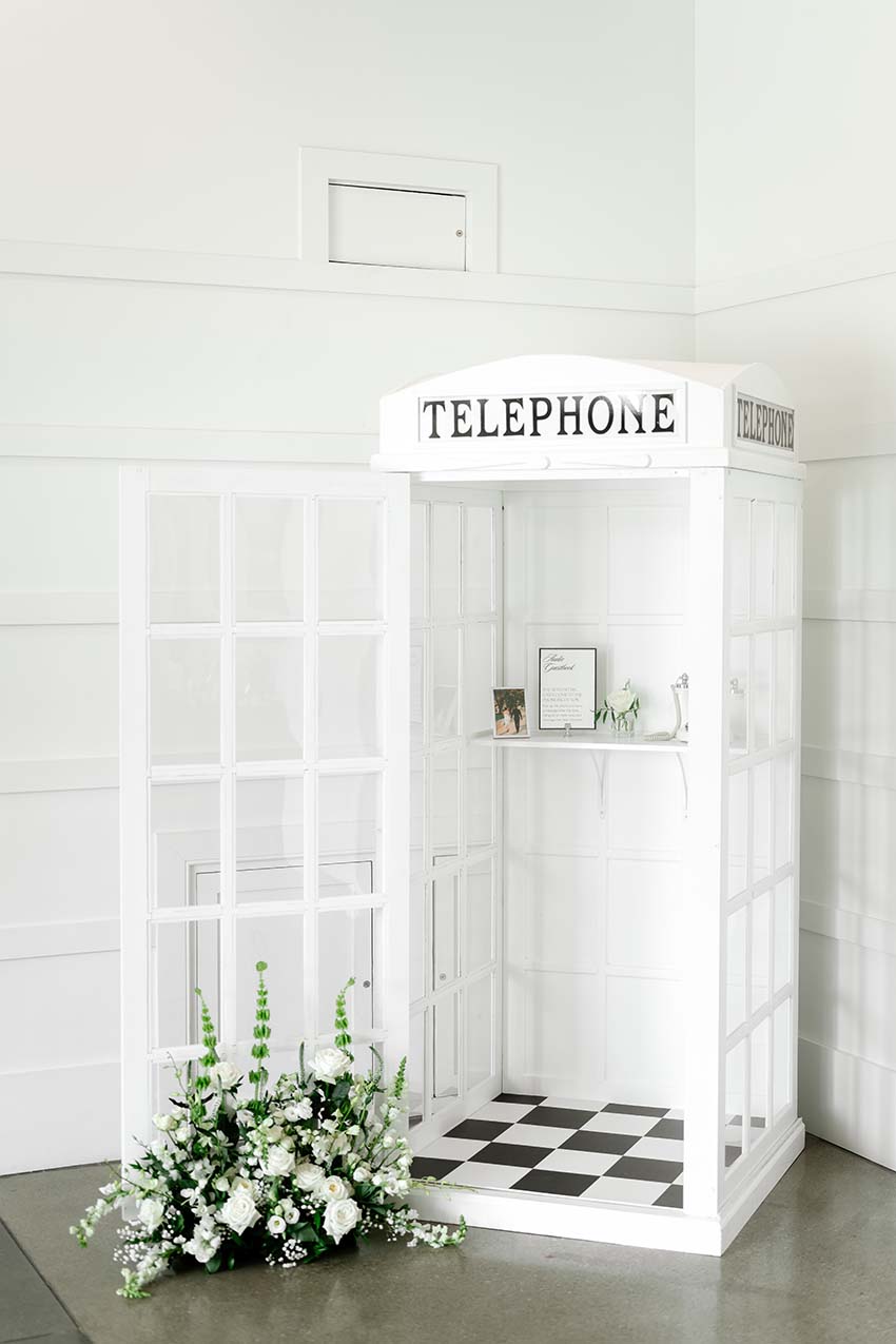 Looking for a unique, British-inspired touch for your wedding or event? Our full-size white phone booth prop, styled after the iconic London red phone box, is a show-stopping addition to any venue. With bold black “TELEPHONE” lettering, this phone booth brings timeless charm and sophistication, perfect for wedding photo booths, themed parties, or as a distinctive focal point at weddings and other special events.